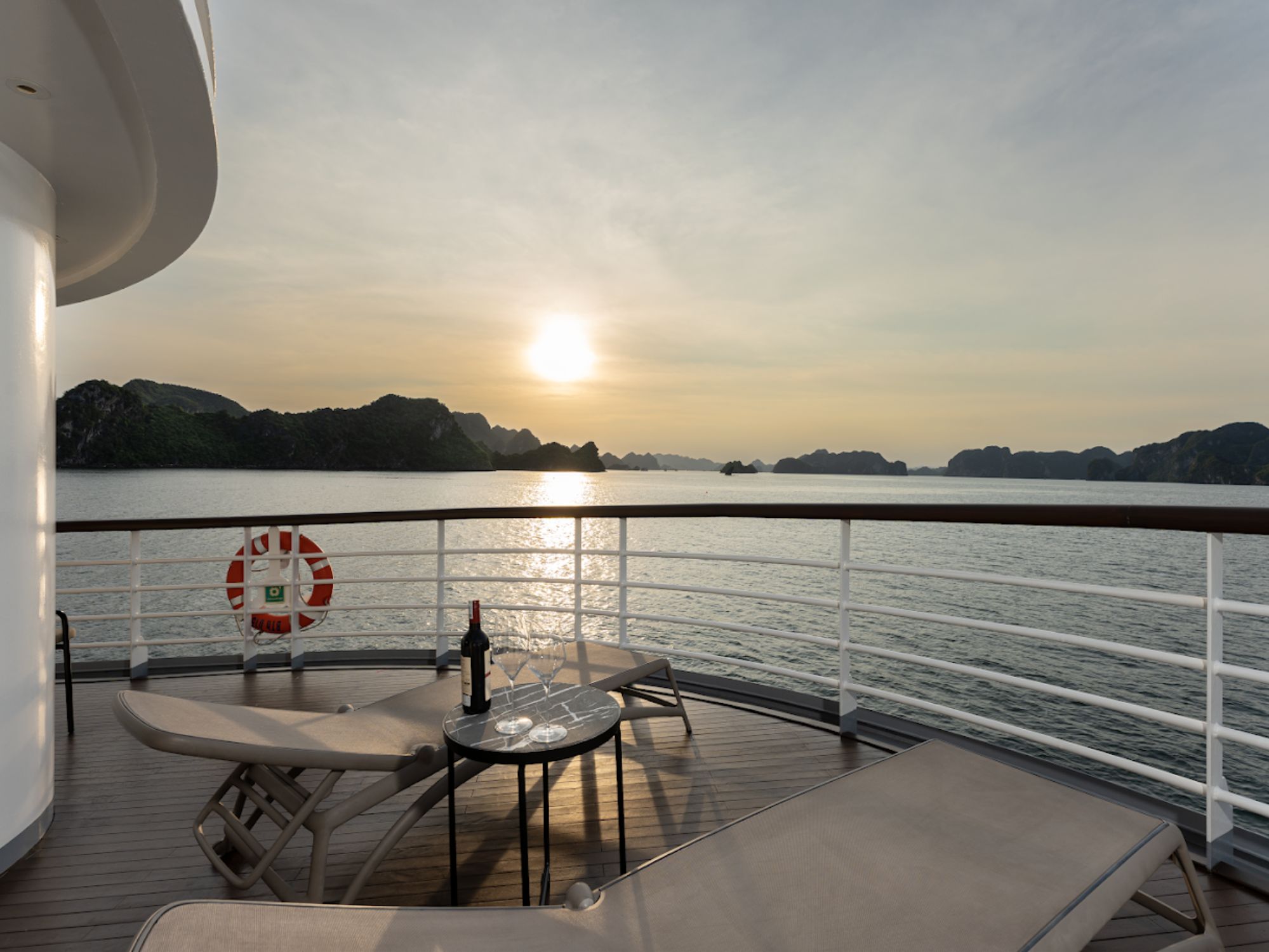 If you want to focus on just visiting Lan Ha Bay, you have the option to book an Overnight Cruise at Ambassador Signature Cruise. This ship is the latest addition to the Ambassador Cruise Line fleet, complementing its Halong Bay sister ships, Ambassador I and Ambassador II. With just 39 spacious cabins starting at 28 square meters, each featuring a private balcony and well-appointed ensuite bath, it provides a luxurious retreat. Furthermore, just like its sister ships, the Ambassador Signature Cruise boasts a spa, a refined piano lounge, and a sundeck adorned with comfortable loungers, perfect for ultimate relaxation.