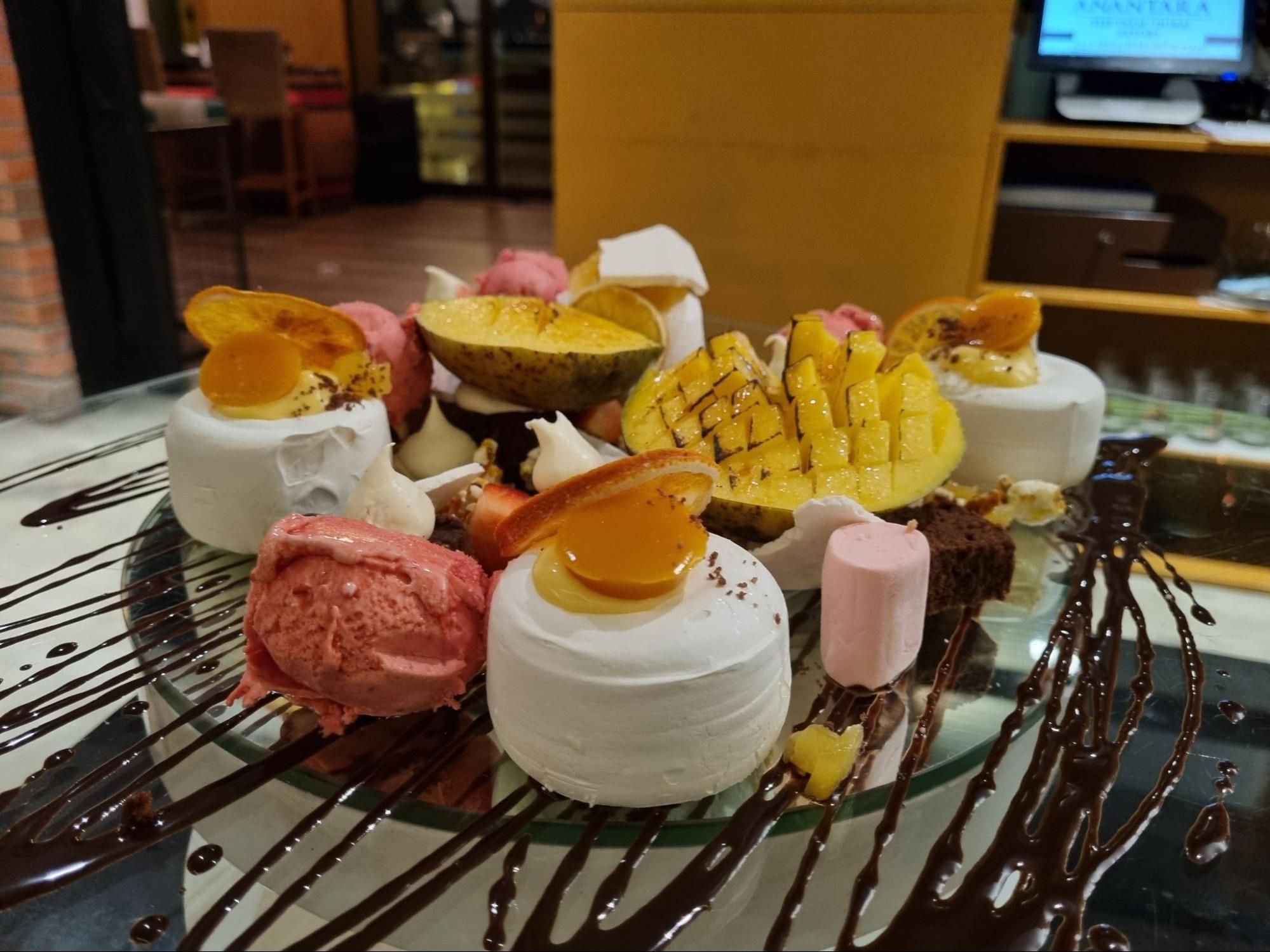 To end your meal on a sweet note, we highly recommend ordering the Australian Dessert, expertly constructed by a chef right at your table. This interactive treat is sure to delight both adults and kids alike, as the chef artfully combines a medley of delicious ingredients including Pavlova meringue, velvety chocolate mousse, decadent chocolate soil and sauce, luscious chantilly cream, tangy raspberry coulis, refreshing raspberry sorbet, and freshly caramelized mango cheeks to create a visually stunning masterpiece.