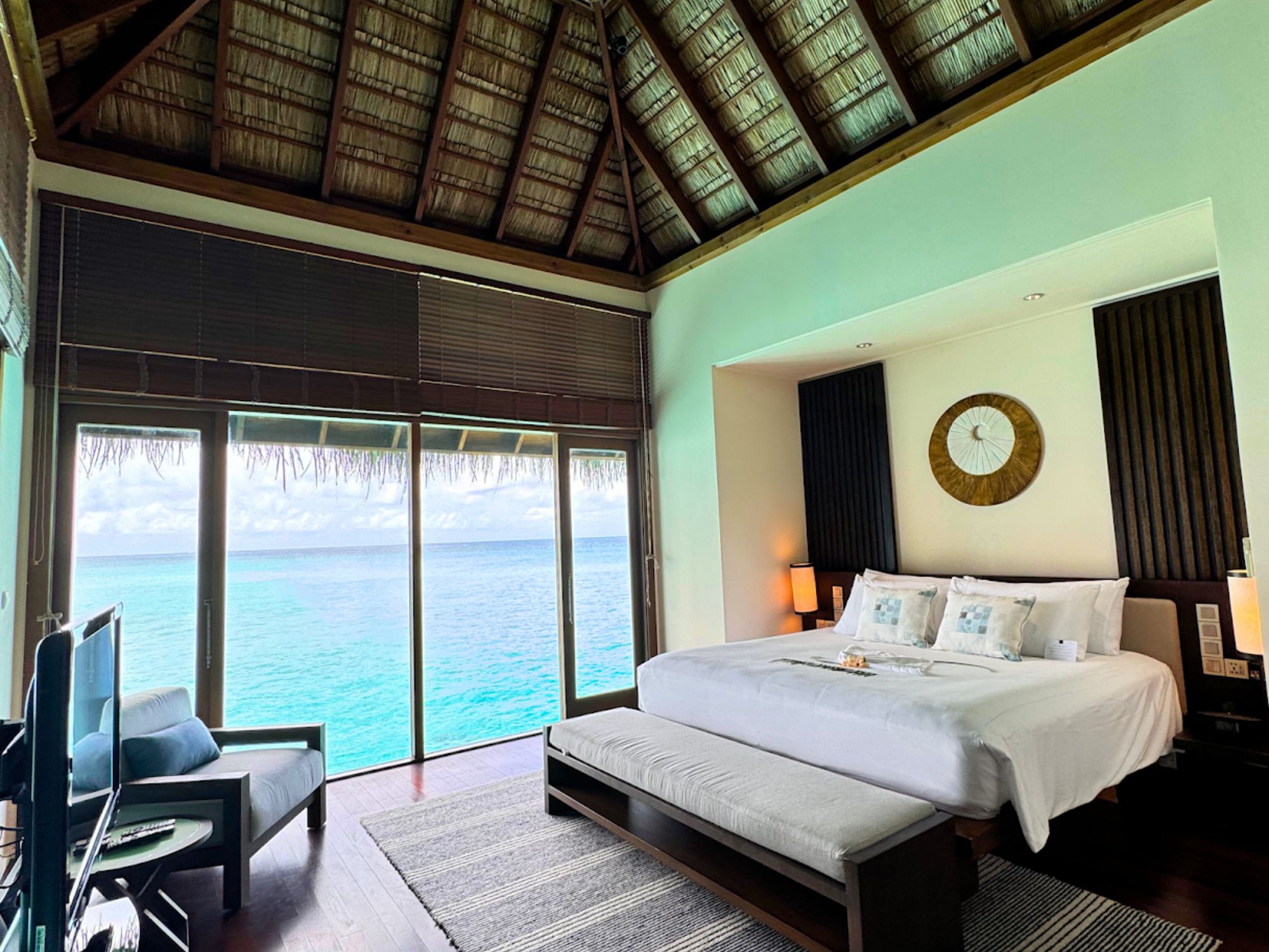 Spanning 150 square metres, this exquisite Grand Water Villa comfortably accommodates three guests. The bedroom, living area, and bathroom with vanity area are among the most spacious we have ever encountered. The grand vanity, with its breathtaking ocean view, quickly became a favourite—truly one of the most beautiful spaces we have seen. Showering or soaking in the bath while gazing out at the endless ocean was an exceptional and unforgettable experience!