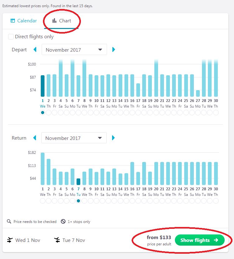 Skyscanner solves that problem with their ‘Cheapest month’ function, so you can easily find out when the cheapest dates of travel are. You can view the cheapest function in two ways – the calendar or chart function.